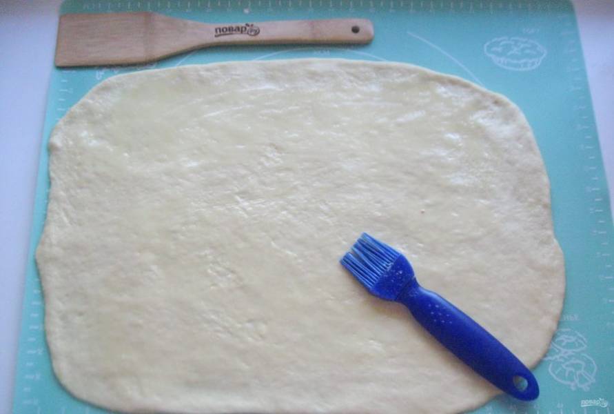 Тесто обомните и раскатайте в пласт толщиной 0,5 сантиметра. Смажьте мягким сливочным маслом.