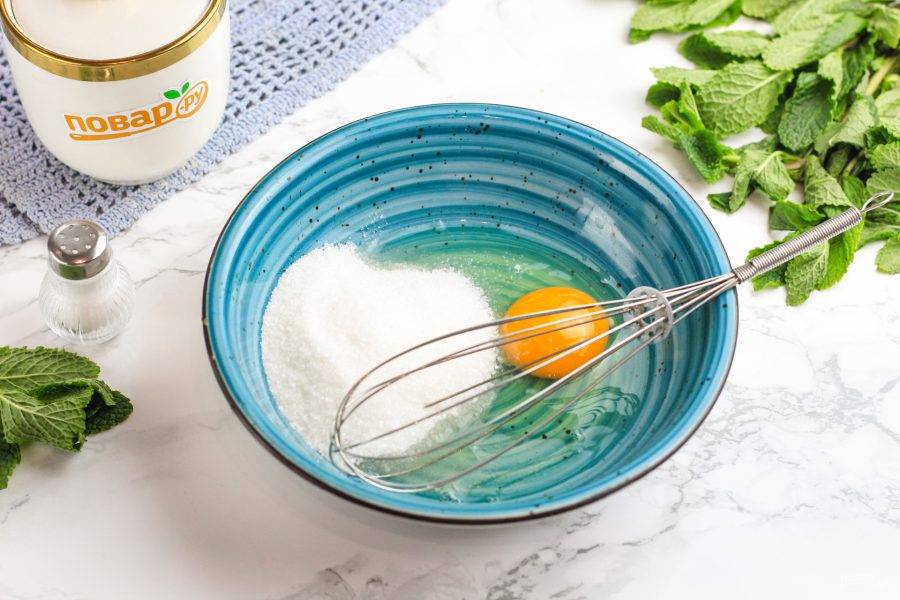 Вбейте куриное яйцо в глубокую емкость, всыпьте сахар и соль. Взбейте все венчиком.