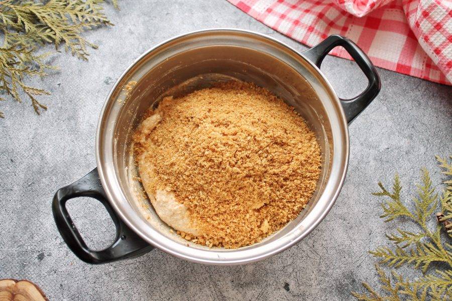 Печенье измельчите в мелкую крошку и добавьте в творожную массу. Всё хорошо перемешайте.