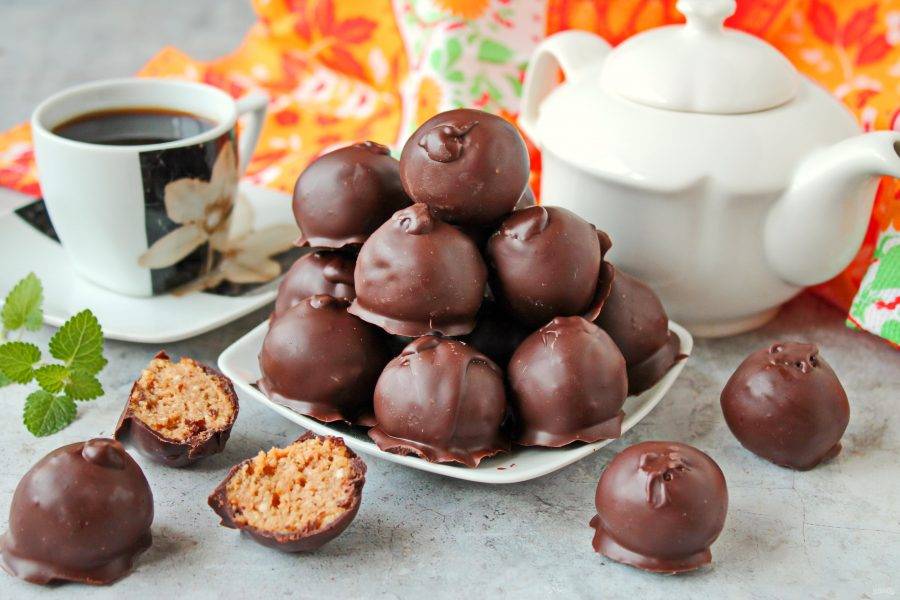 Шоколад растопите на водяной бане и остудите до текучего состояния. Решетку для выпечки застелите пленкой. Каждый шарик проткните зубочисткой и полностью окуните в растопленный шоколад. Переложите конфеты на решетку с пленкой на расстоянии, извлеките зубочистку и уберите в холод до застывания. После этого творожные конфеты с печеньем можно подавать на стол.