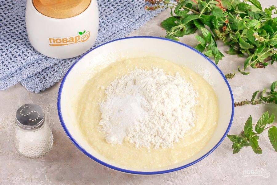 Всыпьте пшеничную муку высшего сорта и разрыхлитель, добавьте ванильный сахар. Еще раз все тщательно перемешайте.