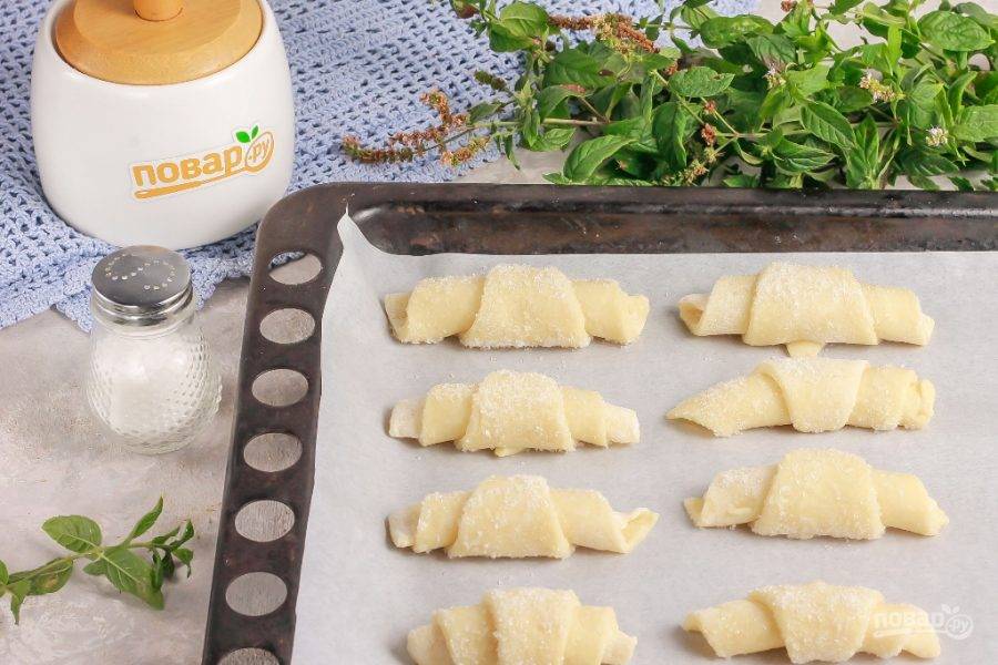 Высыпьте оставшийся сахар на тарелку и обпанируйте в нем заготовки рогаликов.