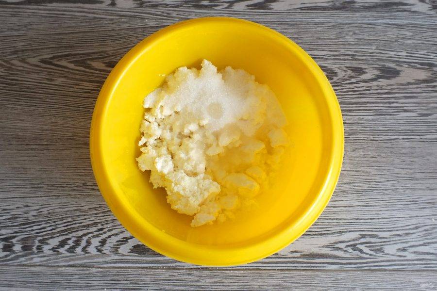 Сделайте начинку. В чаше смешайте творог, сахар и яичный белок. Перемешайте.