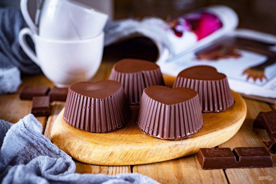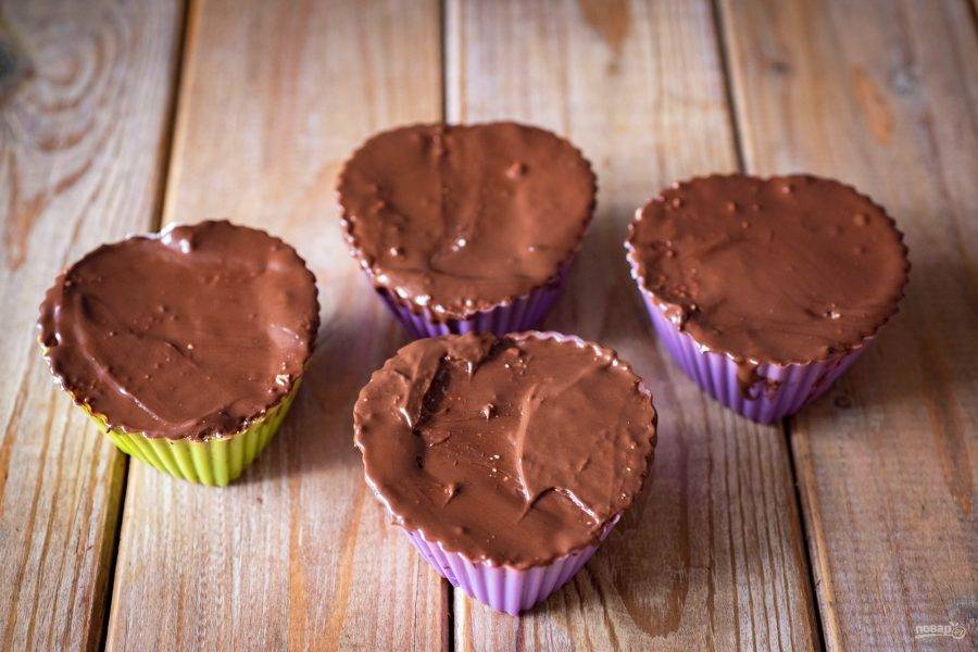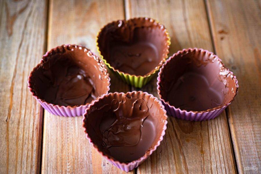 Внутреннюю поверхность силиконовых формочек смажьте слоем растопленного шоколада и отправьте эти формочки в морозильную камеру на 15 минут.