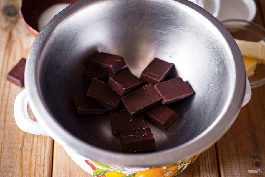 В миску выложите шоколад, поломанный кусочками, установите миску на кастрюльку с водой так, чтобы дно миски не касалось поверхности воды, включите небольшой нагрев.