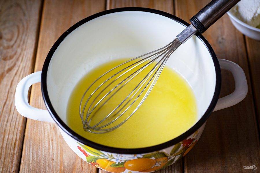 Помешивая венчиком, на небольшом огне растопите сливочное масло и дождитесь, когда полностью растворится сахар.