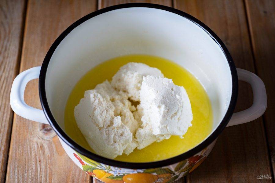 Снимите кастрюльку с плиты и добавьте к растопленному маслу с сахаром творог и ванилин.