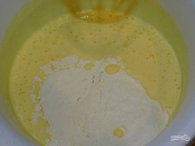 Взбейте 2 яйца со 100 г сахара. Добавьте 180 г муки и соду.