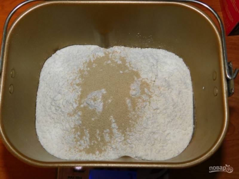 Добавьте яйцо, муку и дрожжи. Поставьте на "Основной" режим выпечки в хлебопечке. Вес 750 гр, корочка средняя. У меня он длится 3 часа.