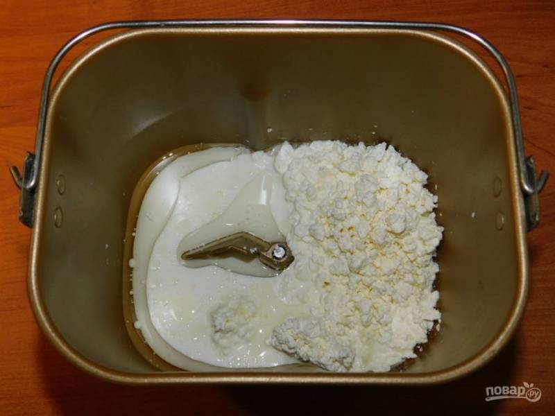 В чашу хлебопечки налейте растительное масло и молоко. Добавьте творог, соль и сахар.