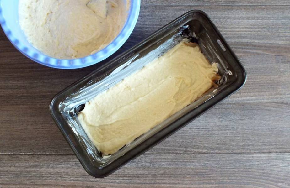 Возьмите форму для выпечки, смажьте маслом или застелите пекарской бумагой. Тесто визуально разделите на три части. Одну часть выложите в форму. Разровняйте.