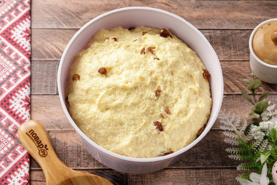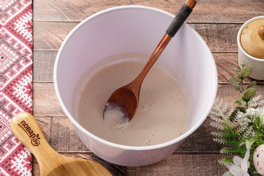 Накройте миску полотенцем и оставьте в тёплом месте на 1,5 часа или до увеличения в объёме в 2 раза.