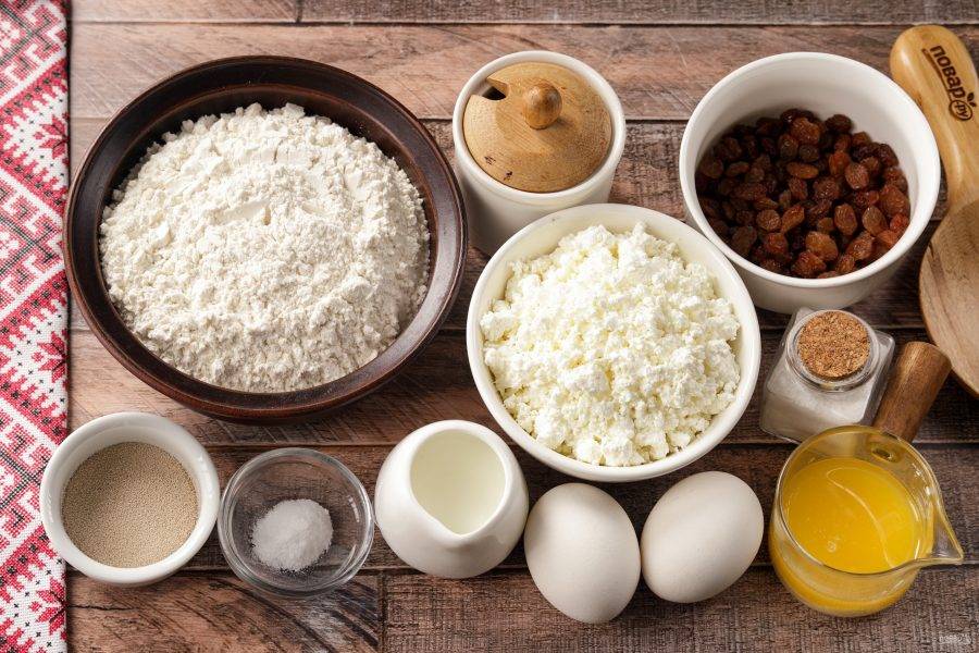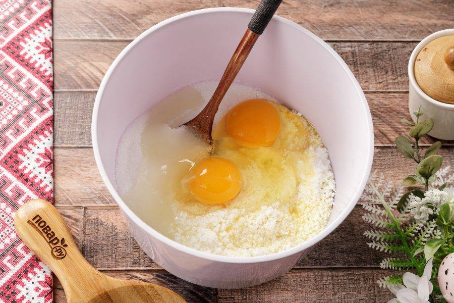 Добавьте к опаре перетёртый творог, яйца, сахар, растопленное масло, ванилин и соль.