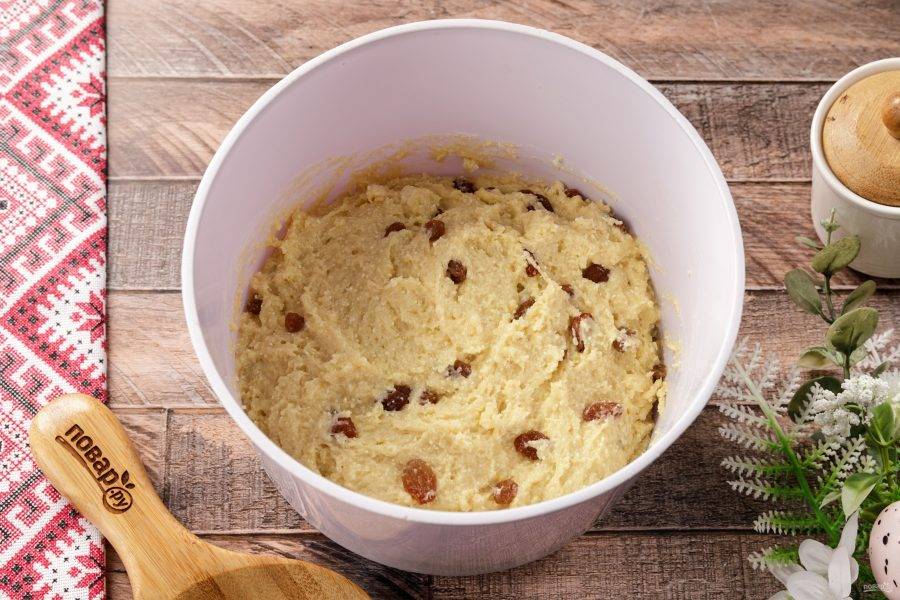 Перемешайте и добавьте промытый и обсушенный изюм.