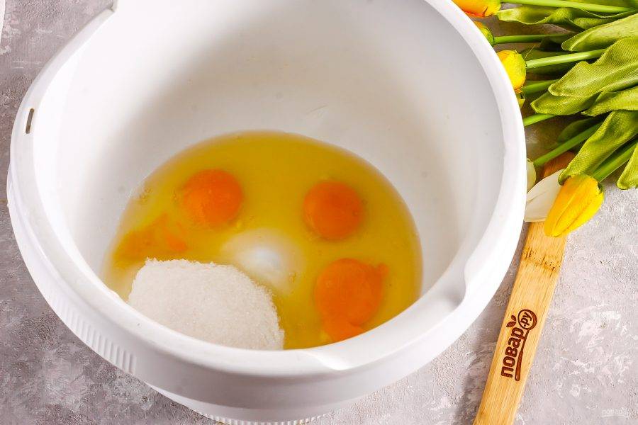 Куриные яйца вбейте в емкость миксера или кухонного комбайна, добавьте соль и сахар. По желанию можно всыпать и ванильный сахар. Взбейте 4-5 минут в пышную пену.