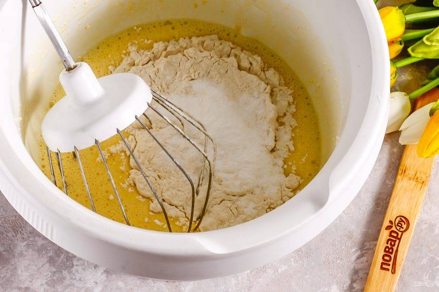Всыпьте муку и разрыхлитель, вмешайте силиконовой лопаткой или венчиком, но не взбивайте, чтобы не выпустить пузырьки воздуха из теста. Разогрейте духовку до 180 градусов.