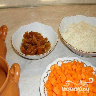 1. В первую очередь очищаем тыкву. Небольшими кубиками нарезаем мякоть тыквы. Промываем рис и затем его отвариваем.