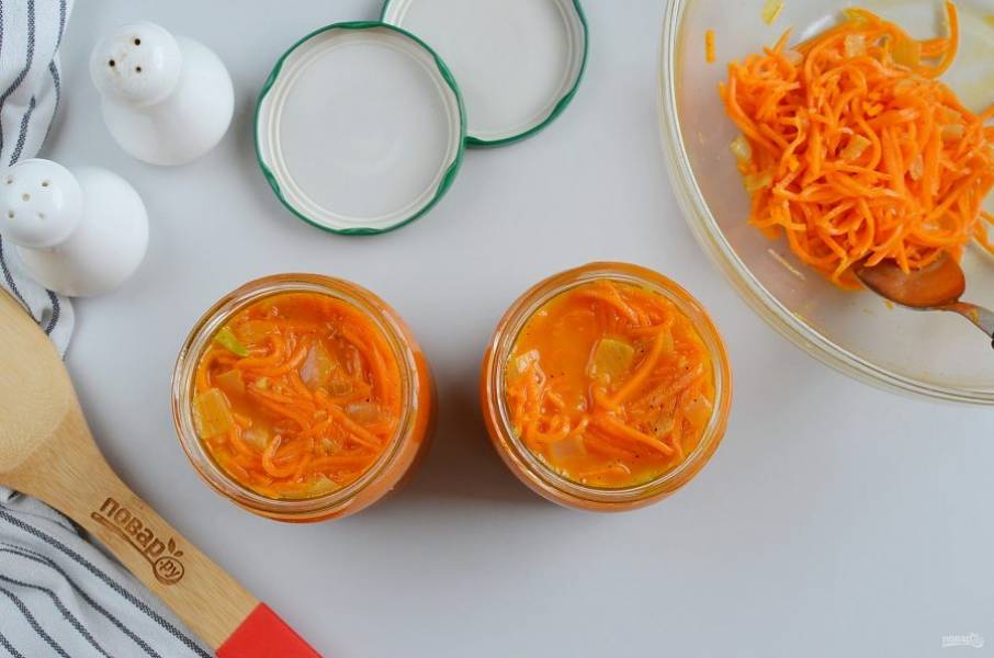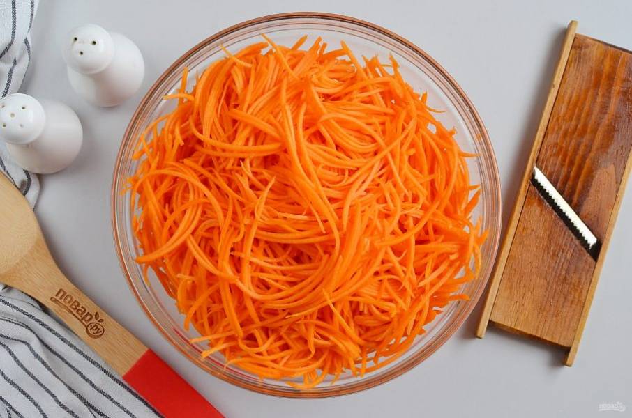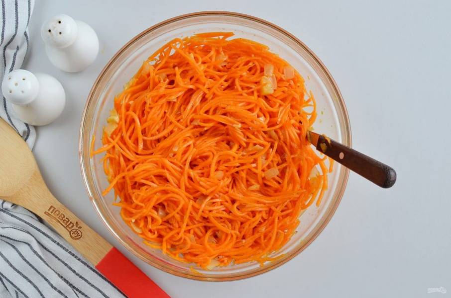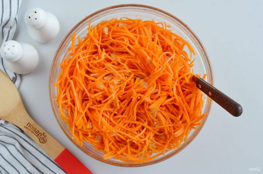 Добавьте жареный лук, пропущенный через пресс чеснок, соль, сахар, уксус, специи для моркови по-корейски.