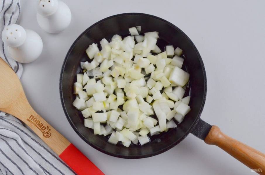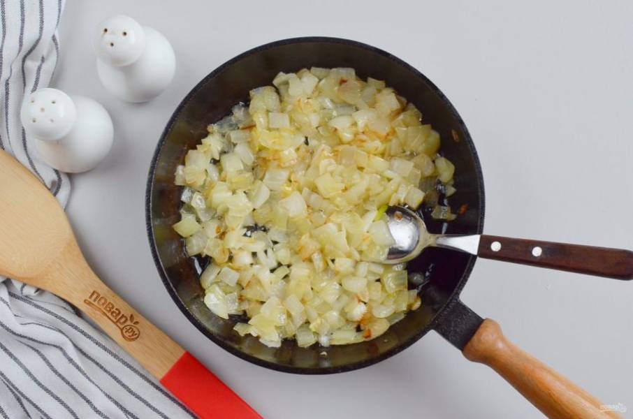 Очистите репчатый лук, порежьте. На растительном масле обжарьте до мягкости.