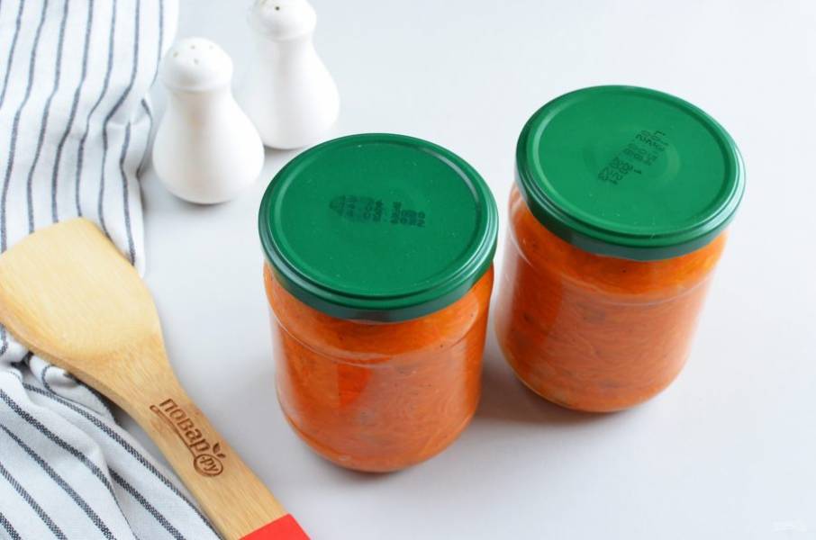 Простерилизованный салат закрутите плотно крышками. После остывания перенесите в теплое место для хранения, погреб или кладовку.