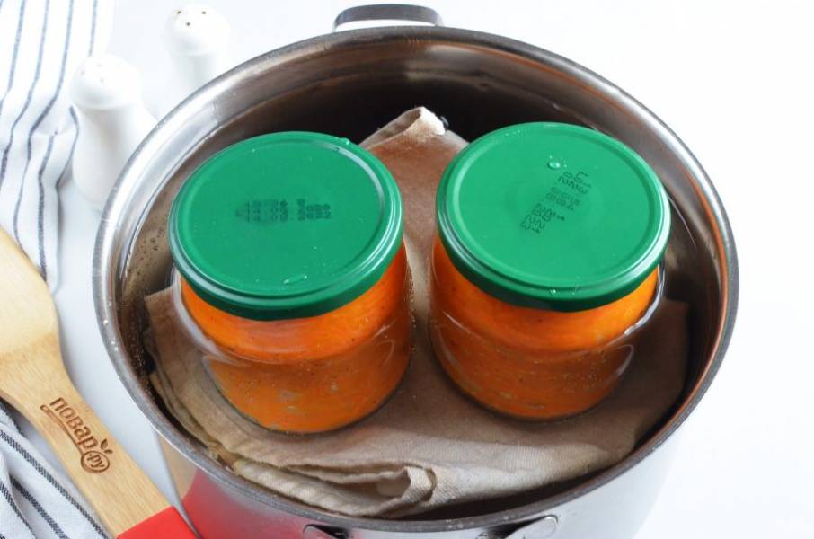 В теплую воду на салфетку поставьте банки. Доведите до кипения воду, стерилизуйте 25 минут. Крышками прикройте, но не закручивайте.
