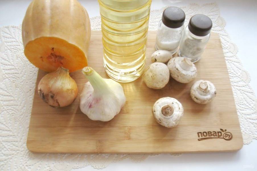 Подготовьте ингредиенты для приготовления тыквы с грибами.