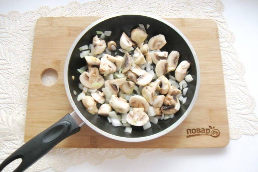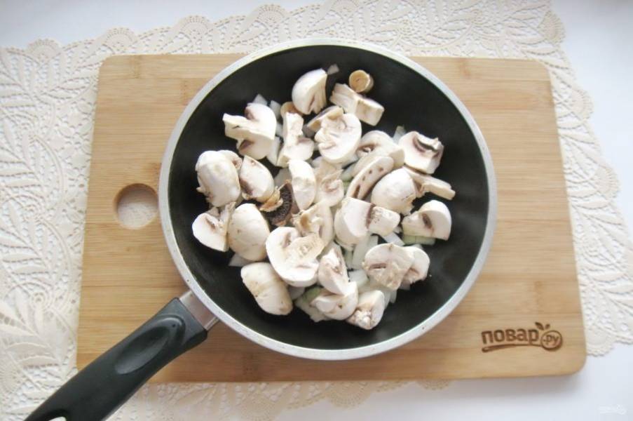Грибы очистите, помойте и нарежьте на несколько частей, но не очень мелко. Добавьте в сковороду к луку.