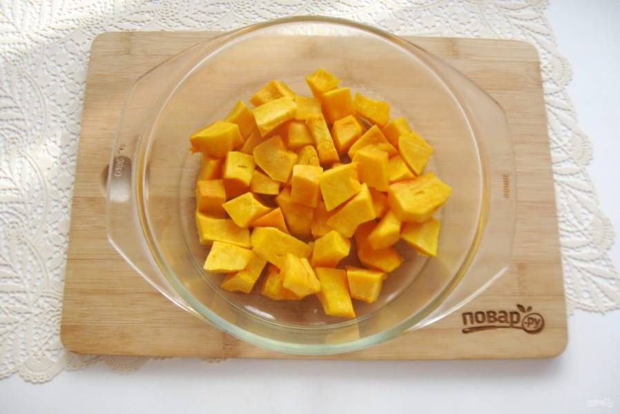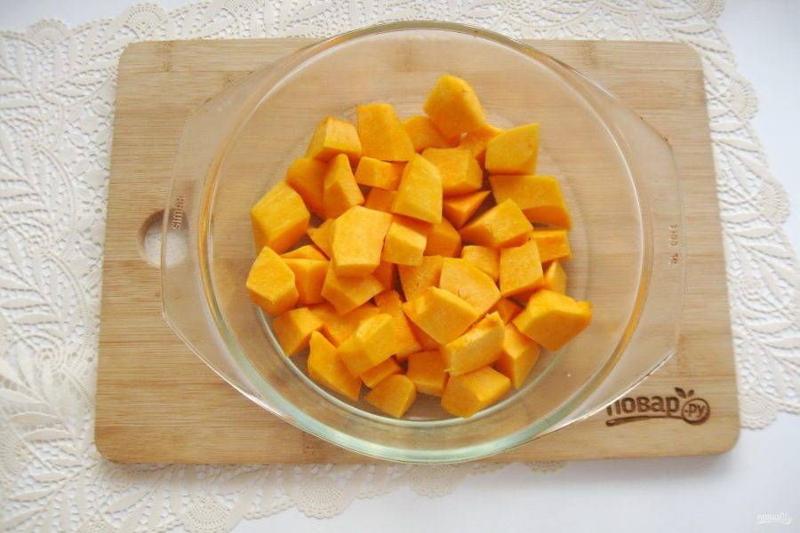 Тыкву очистите, удалите семечки, помойте и нарежьте кубиками. Выложите в жаропрочную форму.