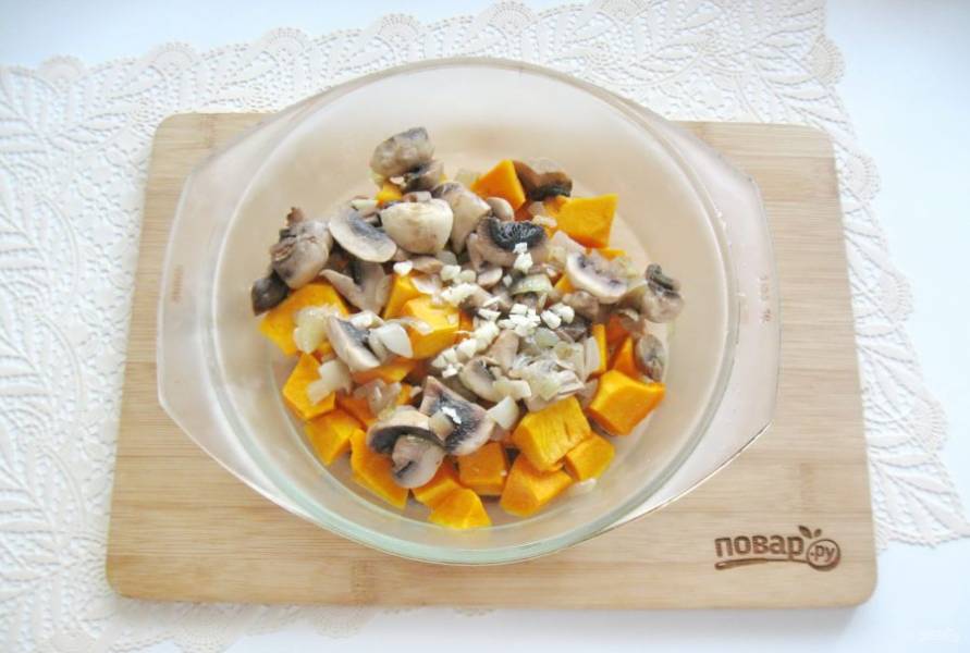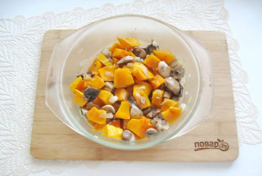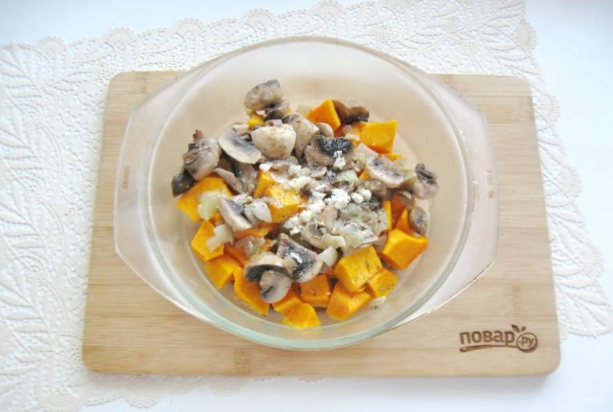 Добавьте жареный лук с грибами к тыкве.