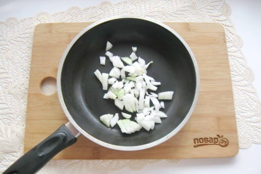 Репчатый лук очистите, помойте и мелко нарежьте. Выложите в сковороду.