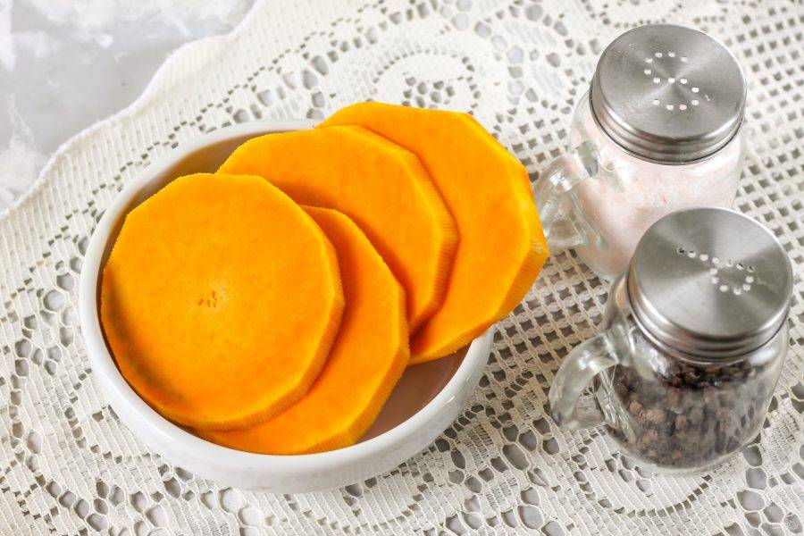Тыкву промойте в воде, срежьте с овоща кожуру, удалите семена и еще раз промойте. Нарежьте тонкими кружочками и пластинами, чтобы она прожаривалась с обеих сторон. Если тыкву нарезать толсто, то она не прожарится!