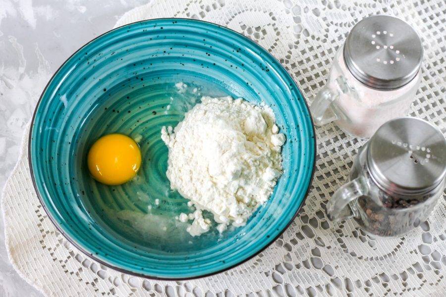 В глубокой емкости соедините куриное яйцо, муку, воду, соль и все взбейте, превращая в кляр.