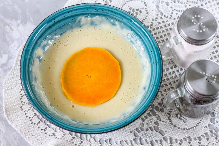 Обсушите каждый кусочек тыквы бумажным полотенцем и обмакните в кляр со всех сторон.