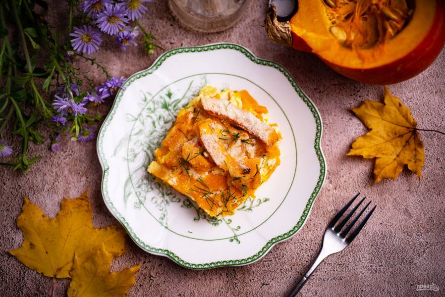 Присыпьте все панировочными сухарями. Отправьте заполненную форму в уже заранее разогретую до 180 градусов духовку. Запекайте тыкву примерно 20-30 минут до мягкости ломтиков. Обязательно проверяйте тыкву на мягкость вилкой и, если необходимо, увеличивайте время запекания.