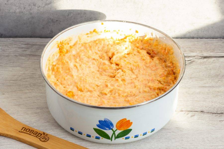 В последнюю очередь добавьте овощи. Выложите тесто в чашу мультиварки и выпекайте на режиме "Выпечка" от 1 часа до 1 часа 20 минут. Зависит от мощности мультиварки. Пирог немного влажный, это нормально.