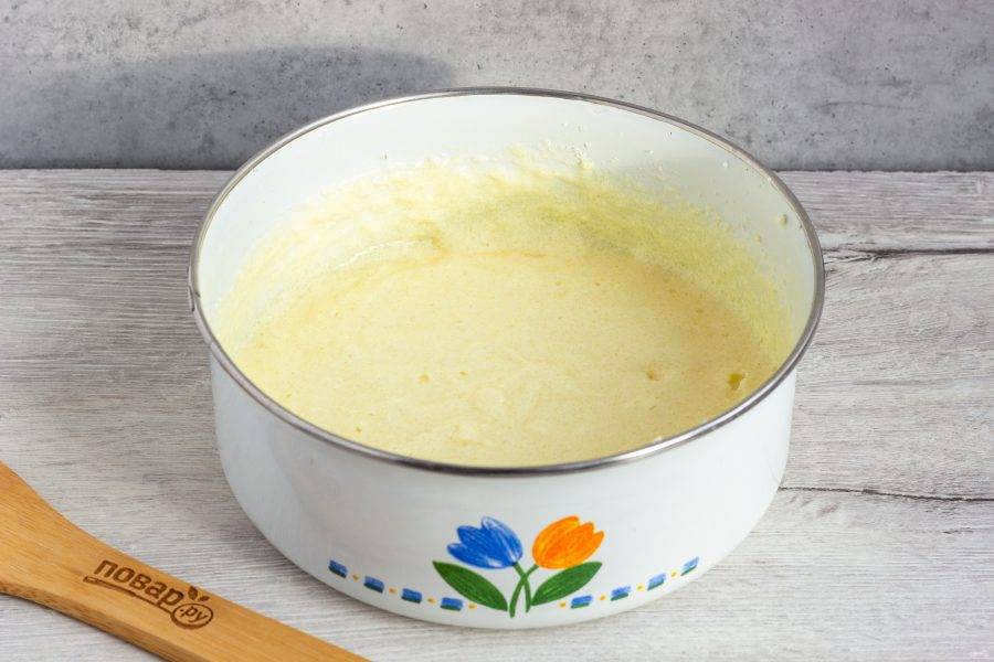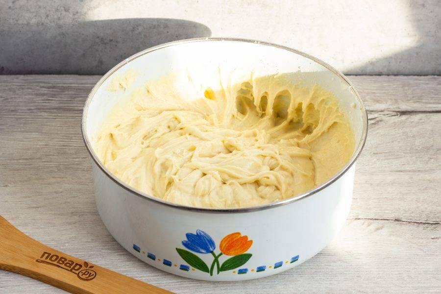 Масло комнатной температуры взбейте с сахаром, по одному вбейте яйца. Затем добавьте сметану.