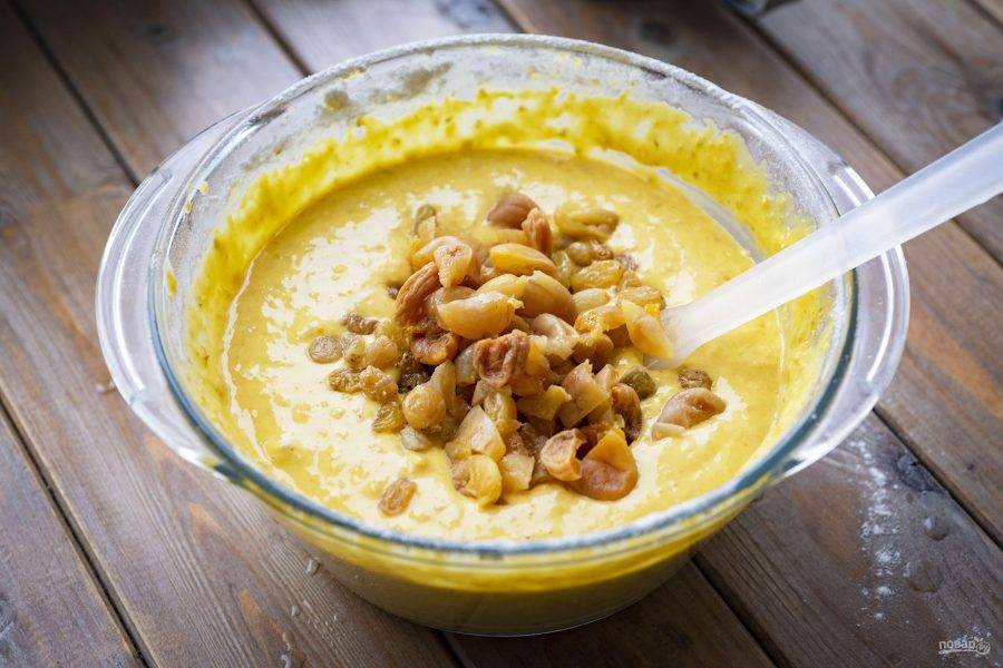 К тесту добавьте изюм и нарезанную небольшими кусочками курагу. Вмешайте сухофрукты в тесто лопаткой.