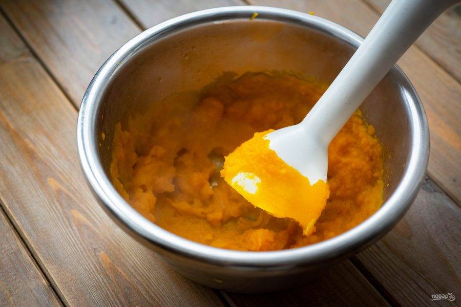 К этой смеси добавьте тыквенное пюре, слегка охлажденное. Перемешайте венчиком.