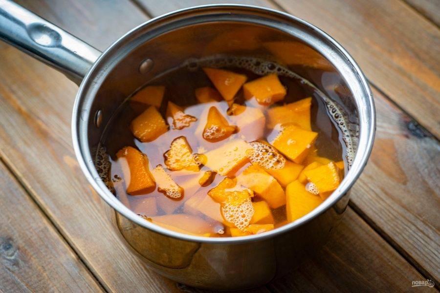 Очищенную тыкву нарежьте кубиками небольшого размера, выложите в сотейник, залейте водой и отварите до мягкости. Воду слейте.