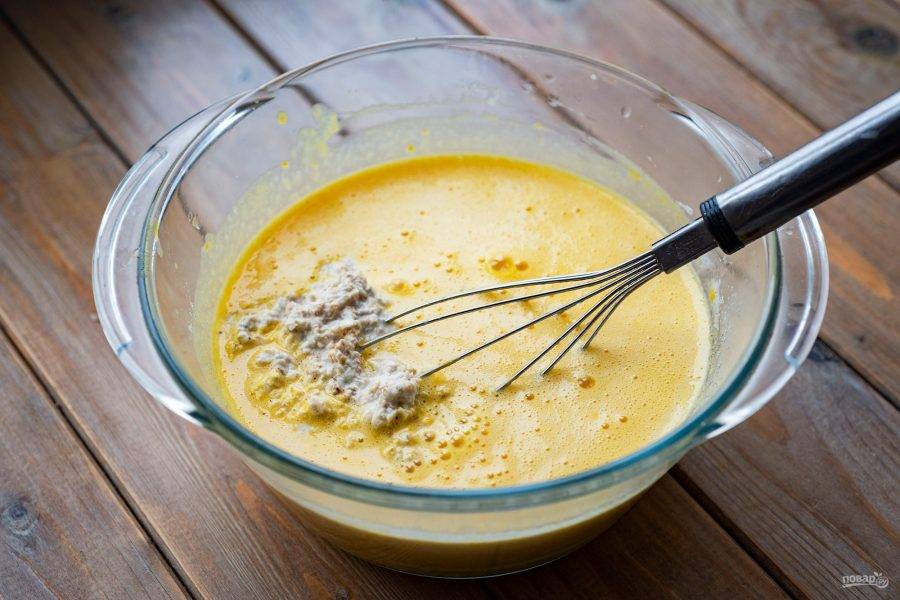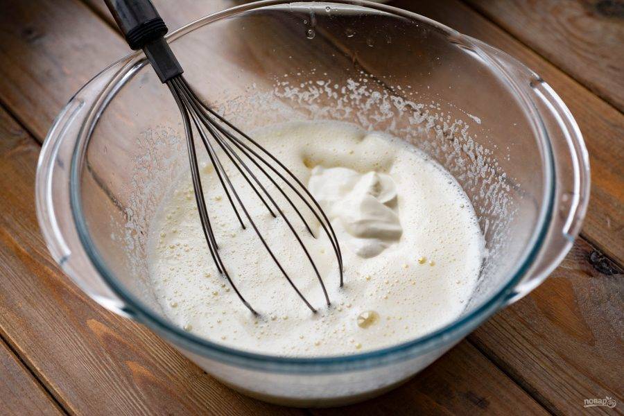 Залейте к яичной массе растительное масло и добавьте сметану. Перемешайте все венчиком.