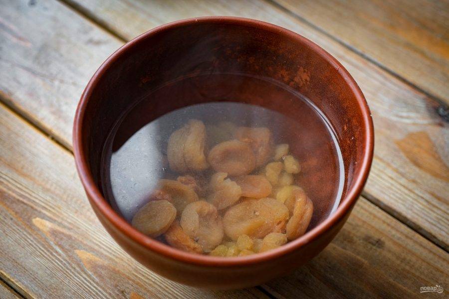 Курагу и изюм выложите в отдельную миску и залейте кипятком, также оставьте на 20 минут.
