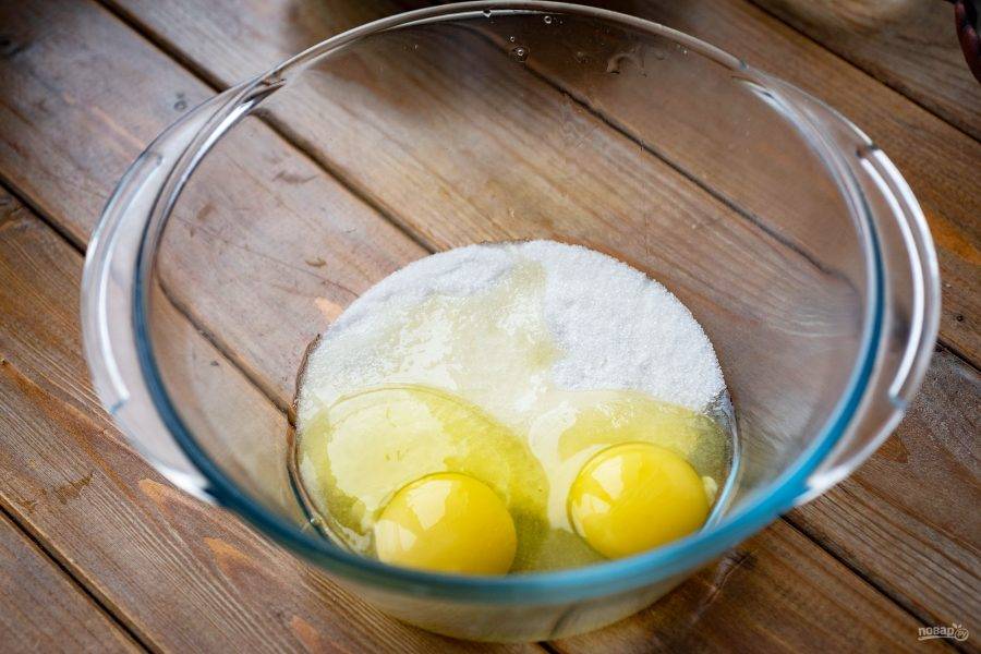 В просторную миску вбейте яйца, добавьте сахар.