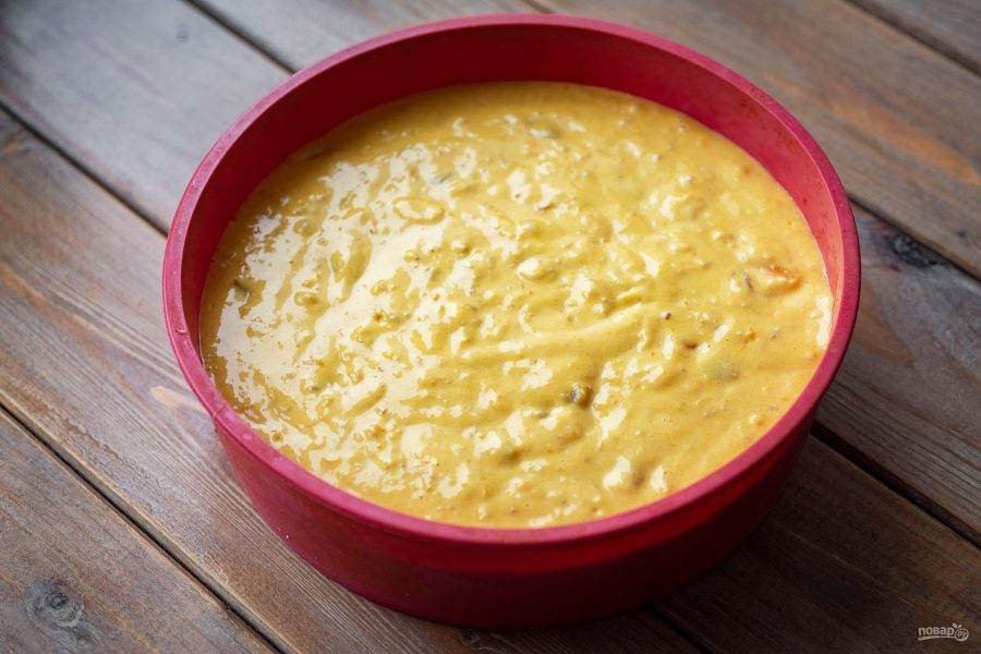 Готовое полностью тесто выложите в форму для выпекания. У меня форма силиконовая, поэтому я ее ни чем не смазывала и бумагой для выпечки не выкладывала. Выпекайте пирог в уже разогретой до 180 градусов духовке 45-50 минут. Готовность обязательно проверьте деревянной шпажкой.