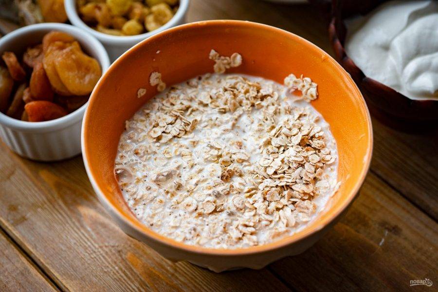 Овсяные хлопья выложите в удобную мисочку, залейте молоком и оставьте на 20 минут.