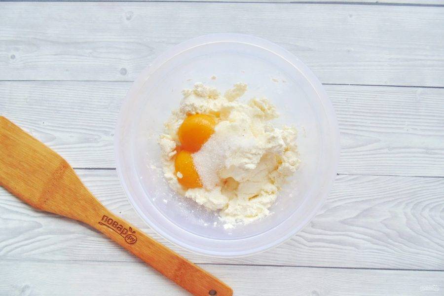 В отдельную миску выложите творог. Добавьте желтки яиц, сахар и щепотку соли.