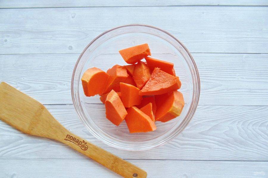 Тыкву вымойте, очистите, нарежьте на кусочки. Переложите в жаропрочную посуду.
