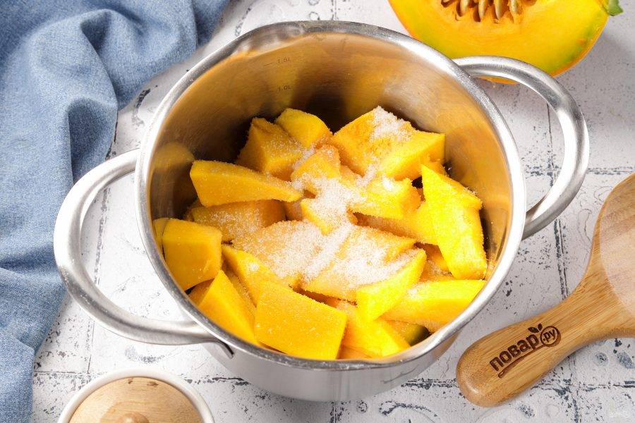 Отрежьте от тыквы необходимое количество, предварительно очистив её от кожуры и семян. Нарежьте кусочками, переложите в сотейник или кастрюльку, добавьте 1 ст.л. сахара и воду.