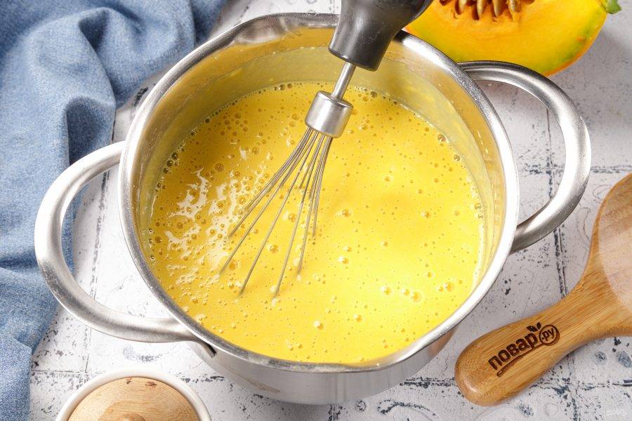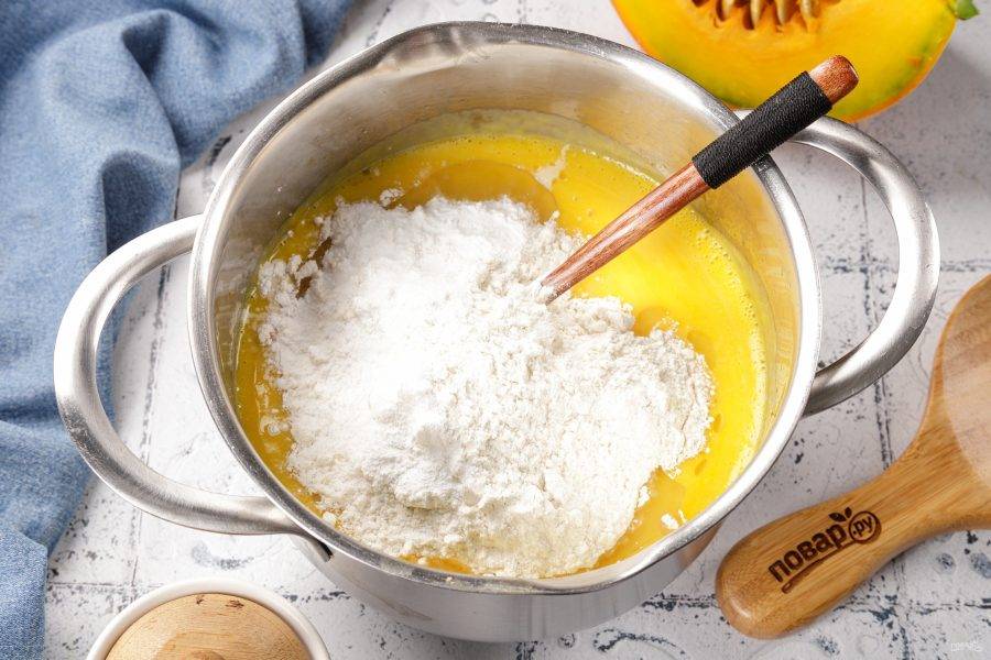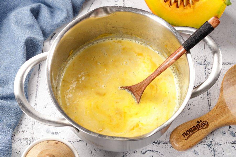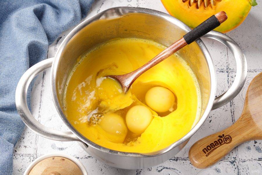 Когда масса немного остынет, добавьте яйца, соль и оставшийся сахар.