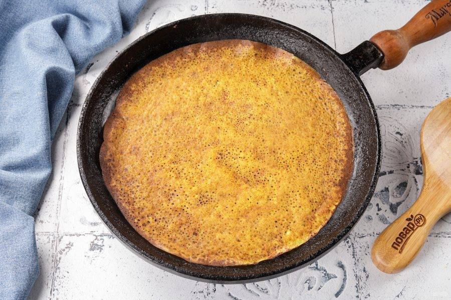 Разогрейте на сильном огне сковороду, лучше специальную блинную с антипригарным покрытием. Смажьте ее небольшим количеством растительного масла. Вылейте порцию теста, круговыми движениями распределите ее по сковороде. Жарьте блин на одной стороне до румяности, затем переверните на другую. Огонь отрегулируйте так, чтобы блин жарился быстро, но при этом не горел. Готовый блин снимите со сковороды, можете смазать его сливочным маслом. Пожарьте таким образом блины из всего теста.