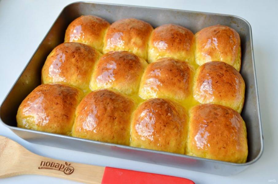 10. Дополнительно я указала в ингредиентах 1 ст. л. меда и 1 ст. л. сливочного масла. Смешайте их, смажьте уже готовые булочки, пока они еще горячие.